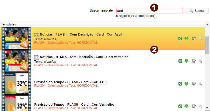 Para encontrar os templates do pacote Card no Studio, utilize o mecanismo de busca presente nas telas de escolha de templates (Área 1 da Figura 1). Os templates resultantes da busca serão listados na área 2 da figura 1.